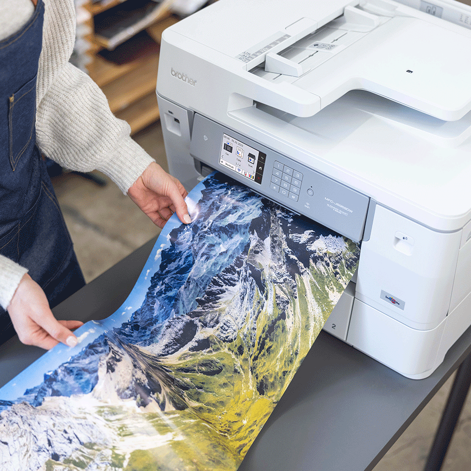 Model MFC-J6959DW zapewnia najwyższej jakości drukowanie i skanowanie w formacie A3 oraz A4 i możliwość drukowania na papierze w rolce. Pozwala na łatwy druk banerów, plakatów, zdjęć panoramicznych i promocyjnych oznakowań, a następnie przycinanie do wymaganej długości za pomocą automatycznego noża.